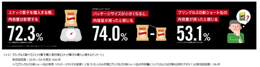 昨今、物価や原材料価格の大幅な上昇、並びに資材費やエネルギーコストなどの高騰に伴い、スナック菓子の商品改定が行われています。そこでプリングルズが行った「【スナック菓子購入者対象】スナック菓子の購入に関するアンケート」(※1)によると、スナック菓子を購入する際、内容量が「とても影響する」もしくは「まあ影響する」と回答した人は、全体の72.3%を占め、「今まで購入していたスナック菓子のパッケージサイズが小さくなった場合、内容量が減ったと感じる」と回答した人は、全体の74.0%もいることが判明しました。このことから、パッケージサイズが購入意向に大きく影響を与えることが分かりました。そんな中、プリングルズの新ショート缶のパッケージサイズの変更に気づいた人に対して、内容量の印象を聞きました。すると内容量はそのままにもかかわらず「内容量が減ったと感じる」と回答した人が53.1%と、約半数以上の人が内容量について減ったと感じるという結果になりました。
