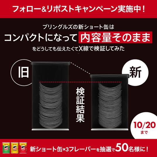 この結果を受け、新ショート缶が「コンパクトになって内容量そのまま」であることをプリングルズらしいあそび心いっぱいのお茶目な方法で皆さんに知っていただきたいという想いで「PRINGLESCAN(プリングルズスキャン)プロジェクト」をスタート。新ショート缶のチップスの内容量が変わっていないことを証明する為、新旧パッケージの両方をX線で透過し、中身が丸見えになった「ポテチのレントゲン広告」を掲出。プリングルズらしく楽しく、かつ、本気で検証した様子を公式SNSで順次公開していきます。