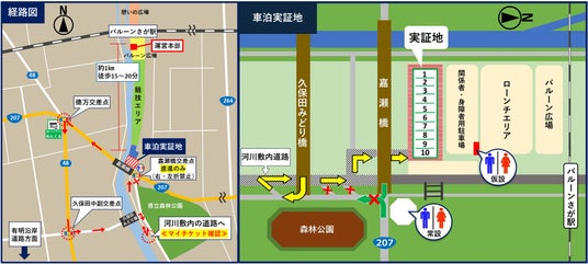 車泊実証実験は、本来は泊まることができないバルーンフェスタ会場南側の関係者駐車場の一部を車泊スペースとしてシェアリングするものです。本実証にて収集する車泊利用データを分析し、会場北側の一般駐車場の混雑緩和に向けた新たなサービスの創出につなげていきます。