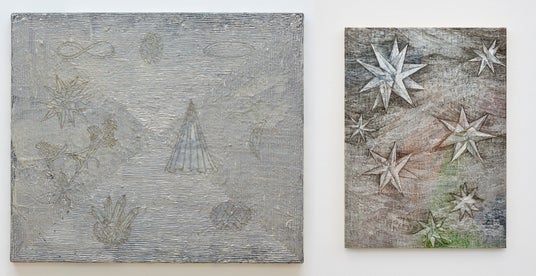 風能奈々(左)私の舟にのせるものシリーズ|The Series of Things to Take on My Boat|2016|Acrylic, gesso on canvas|45.5 x 53.0cm (右)きらきら星|2023|Acrylic on panel|45.5 x 33.3 cm