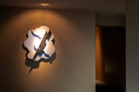 《Descending Painting》は、「稲妻」と「雲」が象徴的に描かれた舘鼻則孝の代表的な絵画作品シリーズです。本作は、仏教において臨終を迎える際に阿弥陀如来と菩薩が雲に乗り迎えに現れる場面を描いた「来迎図」に着想を得て制作されたものです。また、中心に描かれる稲妻は神道における依代に「神のみたまが依り憑く」場面をモチーフとして表しています。先述したような主題から「天と地」や「生と死」などを一対の要素として描くことで、仏教と神道における双方の価値観が共存する「神仏習合」と呼ばれる習合思想が作中に表現されています。