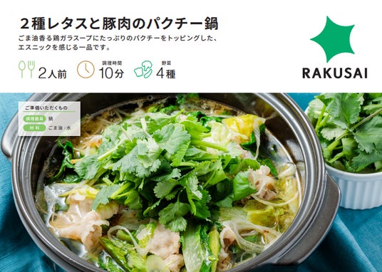 d130004-48-408aa658e0733d3c146cc082a1800b9a.pdf 楽彩株式会社(本社:東京都足立区/代表取締役社長:大崎善保)は、“2種レタスと豚肉のパクチー鍋”を10月7日(月)より販売いたします。「超簡単!RAKUSAI鍋シリーズ」は、鍋に必要な野菜・お肉・鍋の素などがセットされているので、誰でも簡単においしい鍋をつくることができます。鍋シリーズ2024年秋の開幕を告げる第一弾“パクチー鍋”をぜひお楽しみください。