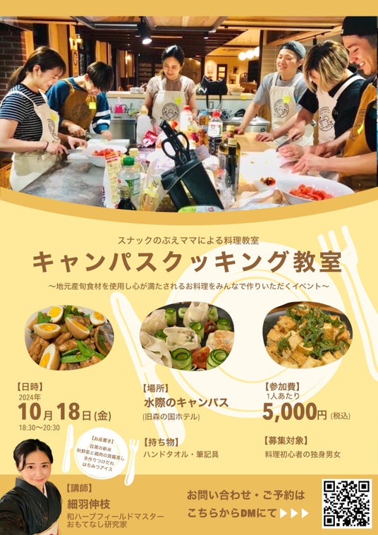 四万十川源流、森の国「水際のロッジ」(愛媛県松野町滑床渓谷)を運営する株式会社サン・クレア(本社所在地:広島県福山市城見町 代表:細羽雅之)は2024年10月18日に、愛媛県北宇和郡松野町滑床渓谷のエコヴィレッジ「水際のキャンパス」にて料理初心者の独身男女を対象にした料理教室「キャンパスクッキング教室(講師:細羽伸枝)」を開催します。本料理教室では、多様な人たちが食を通してキッチンに集い、愛媛県南予地域や松野町の恵みをいただきながら交流を深めることにより、食べることは生きることそのものであり、誰となにをどのように食べるかはその人の心の豊かさにつながるということを感じていただく機会の創出を目指しています。