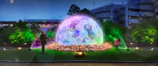 正面玄関前には、幻想的な輝きを放つ巨大なドーム型のオブジェを用意。ミラーボールやホログラムを忍ばせたドームは、ランダムに色が変わり、驚きや感動に出会う高鳴る胸の内に見立てました。大切な人と過ごす特別な時間のモチーフとして、ギフトボックスや花々で足元を彩っています。