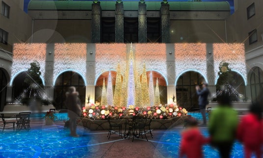 ホテルオークラ東京ベイを象徴する中庭「コートヤード」では中央の噴水を光り輝く湖上の城に見立てました。湖をイメージした水面ライトが幻想的に揺らぐほか、スクリーンのように自在に変化をする迫力ある光の壁が華やぎを添えます。驚きと感動のフォトジェニックな輝きに包まれる空間です。