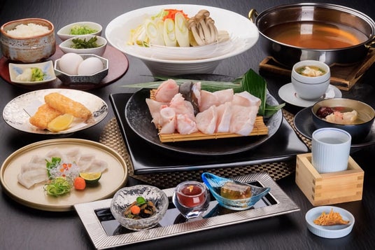 天然クエ会席極み:クエ鍋はもちろん、クエのヒレ酒、お造り、胃袋みぞれがけ柚子釜盛り、米粉揚げなどクエの全身を余すことなく堪能できます(鍋の具材は2名盛り)
