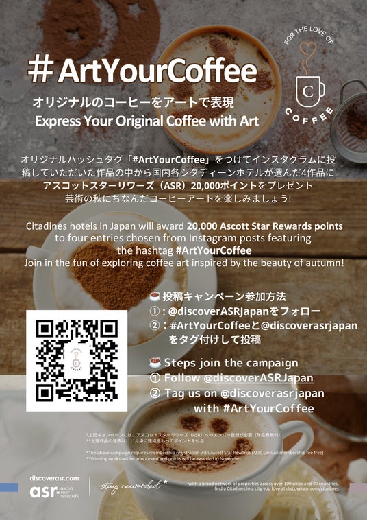また、オリジナルハッシュタグ「#ArtYourCoffee」をつけて、インスタグラムに投稿していただいた作品の中から、国内各シタディーンホテルが選んだ4作品にアスコットスターリワーズ(ASR)20,000ポイントをプレゼント。芸術の秋にちなんだコーヒーアートを楽しみましょう。