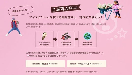 ユーザーは大豆を主原料とするアイスクリームを食べることで不耕起栽培農家を応援し、地球温暖化の緩和に貢献できます。気候アクションの新たなかたちを提案する、“応援型”ECサイトとなっています。