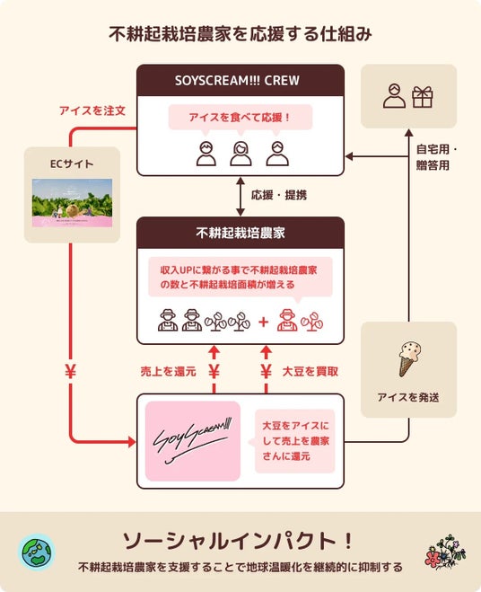 本サイトを通して味わうことができる「SOYSCREAM!!!(ソイスクリーム)」は、耕さないことで土の中に炭素を貯留し地球温暖化の緩和に貢献すると言われている不耕起栽培で育てた大豆を主原料としたアイスクリームです。