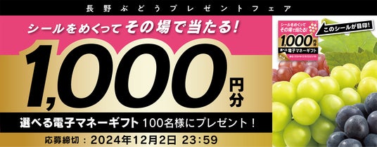 青果の総合流通企業の株式会社ファーマインド(本社:東京都千代田区、代表取締役社長:堀内達生)は、2024年10月8日(火)より、選べる電子マネーギフト1,000円分が100名様に当たる『その場で当たりがわかる長野ぶどうキャンペーン』を実施いたします。
