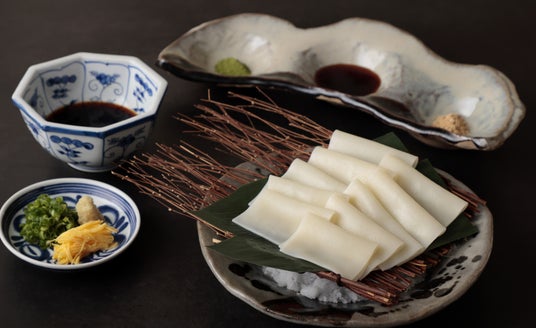 まるで帯のように平たく畳まれた、なめらかなひもかわめん。つゆにつけてつけ麺として、きな粉や黒蜜でデザートとしても、お好みのお召しあがり方でお楽しみいただけます。