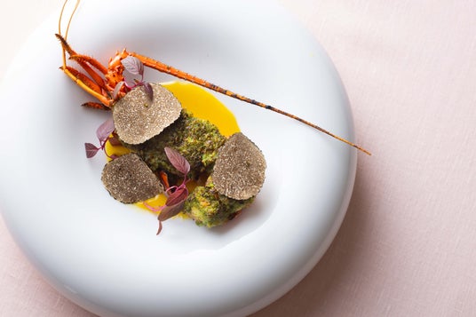 ディナーコースの魚料理「トリュフ香る 千葉県産伊勢海老のブルギニョンバター焼き」