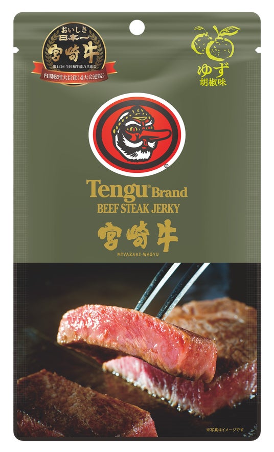 国内屈指の黒毛和牛の産地宮崎県。その中でも最上級のものだけが宮崎牛の名前を許され、その豊潤で奥深い味わいは、国内外で最高評価を得ています。そんな宮崎牛を贅沢に使用した、Tenguブランド初の和牛ジャーキーが誕生。味付けは秘伝醤油味(オリジナル)とゆず胡椒味(宮崎県産ゆず胡椒を使用)の2種類を展開。