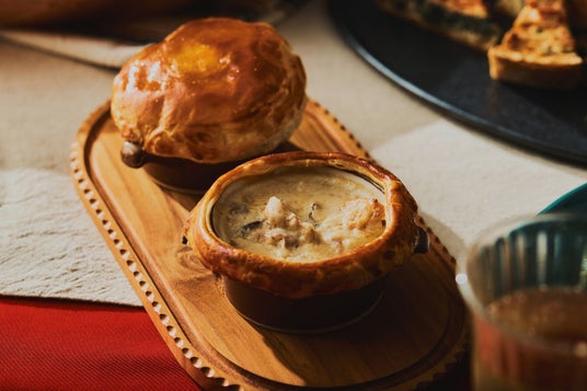 サクサクのパイ生地をくずしながら、キノコやポテト、玉ねぎなどが入った具だくさんのチキンクリームシチューに浸して味わう、秋冬の定番メニュー。やさしい味わいに、お腹も心もほっこり温まる一品です。