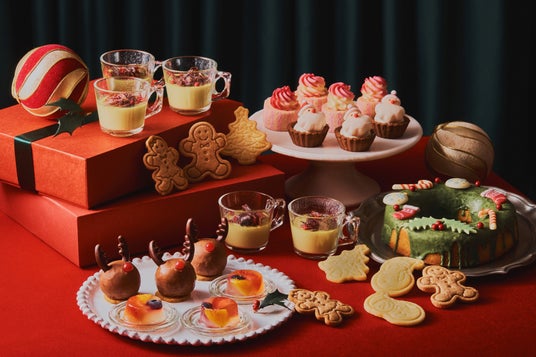 「トナカイのチョコムース」や「ジンジャーマンクッキー」のほか、ロウソクをかたどったロールケーキや、ヘーゼルナッツとフランボワーズを使用したブッシュドノエルなど、クリスマスモチーフのかわいらしいスイーツがラインアップ。