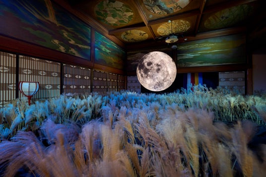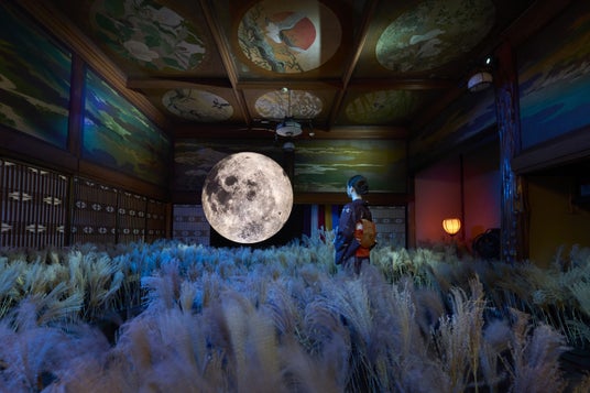 「月百姿」には、ススキが描かれた作品も多く残されています。浮世絵に描かれた風景がそのまま飛び出してきたような空間展示が「草丘の間」に出現。展示会場を埋め尽くす2,000本以上のススキの中に、直径2mの満月が浮かび上がります。ススキたなびく草原で浮世絵のワンシーンのような写真撮影が叶います。