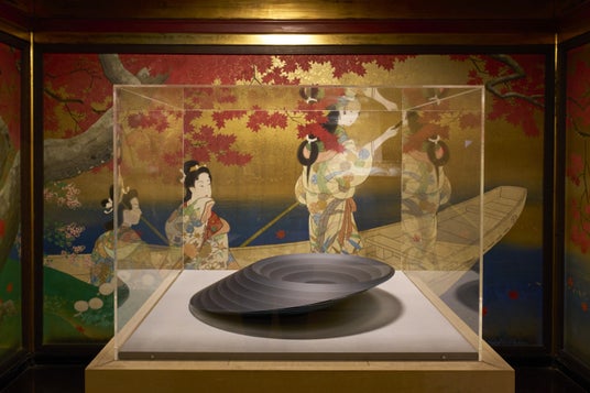 琵琶湖のほとりにある石山寺にこもり湖に映る満月を眺めていた時に構想がひらめいたと伝えられている「源氏物語」。文机でぼんやりと頬杖をつく紫式部が描かれた作品「石山月」から着想を得た空間展示は水と月をテーマにしました。素材と色彩にこだわったダイナミックな展示が絢爛豪華な漁樵の間に溶け込みます。