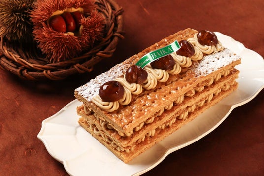 フランス産マロンペーストを使用した、ほんのりとラム酒が香る、濃厚で口どけの良いマロンクリームを、ざっくり食感の手折りパイで挟んだミルフィーユです。