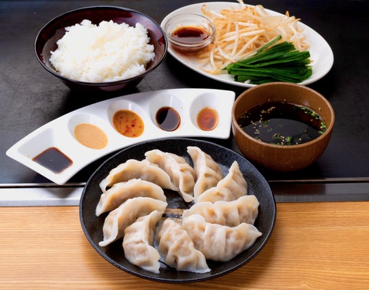 〈初回提供〉餃子8個・タレ5種・ご飯(大盛り無料)・日替わりスープ・野菜