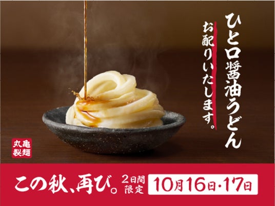 株式会社丸亀製麺(本社:東京都渋谷区、代表取締役社長:山口 寛)が展開する、食の感動体験を追求し、手づくり・できたてにこだわる讃岐うどん専門店「丸亀製麺」は、全国の丸亀製麺※1にて2024年10月16日(水)および17日(木)の2日間限定で、「ひと口醤油うどん」を店内でお食事の方に無料でお配りします。