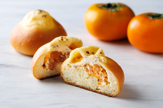 柿に見立てた新作パンの中身はオーブンで焼いた柿とブラックペッパーがアクセントのチーズフィリングを包んだ見た目もかわいらしい1品に。また、キャラメリゼしたリンゴとキャラメルクリームをふんわりとしたスポンジで巻き上げたロールケーキ。そして噛むほどに味わい深いオリーブバケットの3品をご用意致しました。