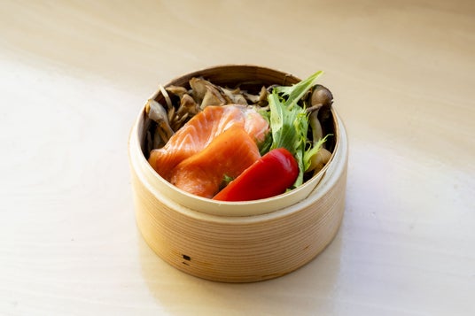 脂の乗ったサーモンと旬のきのこを使ったヘルシーで満足感のあるセイロ蒸しです。
