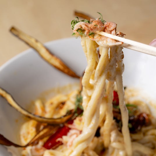桜エビの風味とクリーミーな胡麻豆乳スープの組み合わせの相性抜群。自慢のうどんができました。