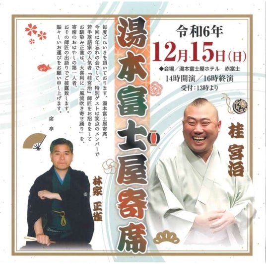 国際興業グループの富士屋ホテル株式会社(本社/神奈川県足柄下郡箱根町宮ノ下359/代表取締役 社長安藤 昭)では湯本富士屋ホテル(神奈川県足柄下郡箱根町湯本256-1/取締役 総支配人 勝俣 克教)にて12月15日(日)に落語と箱根湯本温泉を楽しむ年末の特別イベント「湯本富士屋寄席」を開催いたします。例年お馴染みの林家正雀師匠に、今回が初登場で笑点でも大人気の若手落語家桂宮治師匠を特別ゲストにお招きし、賑やかな寄席をお送りいたします。粋で華やかな落語をお楽しみください。