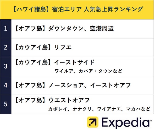 エクスペディアの検索データ※1による、日本人の「ハワイ諸島の人気宿泊エリアランキング※1」を見てみると、最も人気を集めていたのはオアフ島の「ワイキキ」でした。また、2位から4位もオアフ島のエリアがランクイン、5位にはハワイ島の観光のメインエリアとなる「カイルア・コナ」が入りました。