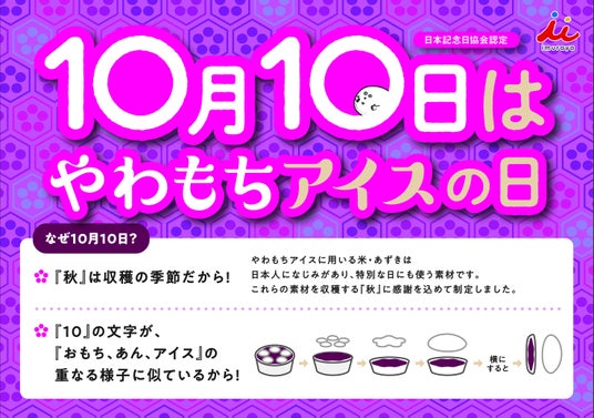 やわもちアイスに用いる米、あずきは、日本人になじみがあり、特別な日にも使う素材です。それらの素材を収穫する秋に感謝を込め、10月に制定しました。また、「やわもちアイス」の容器を横にして、アイスとあんを1に、丸いおもちを0に見立て、1と0を合わせて10日とし、「10月10日」を記念日としました。