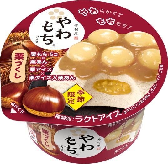 やわらかくてもちもち!の栗もち、栗あん、中心に栗ダイス入栗あんが入った栗アイスの4層構造による、まさに“栗づくし”のカップアイス。