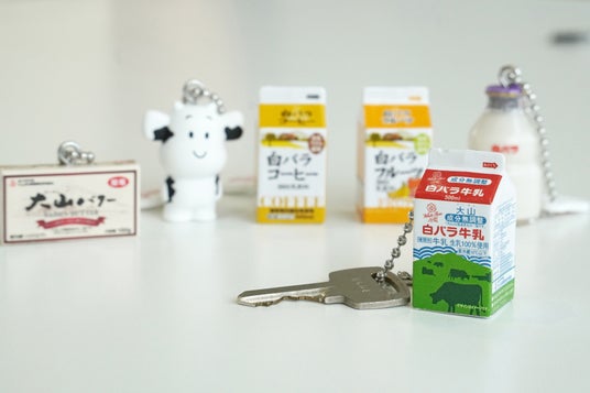 当組合のキャラクター「カウィー」や、白バラ牛乳や白バラコーヒーなど人気商品を含めた全6種のミニチュアチャーム。