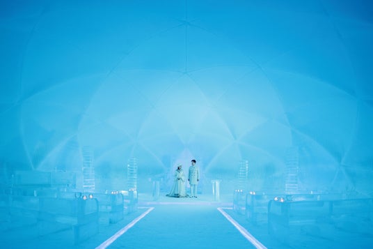 「2人の純粋な気持ちが、途切れなく続く」という想いを込め、継ぎ目のない一枚氷で造られるのが氷の教会です。祭壇や十字架、バージンロード、椅子などすべてが氷と雪でできています。