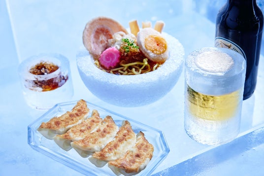 北海道のグルメと言えば、ラーメン。今年も、氷の器に冷たい麺と冷たいスープ、凍ったトッピングを乗せた「氷のラーメン」を提供します。北海道ならではの昆布の出汁を使用したスープと、トッピングのおぼろ昆布がラーメンの味わいを深めます。また、シャリシャリとしたスープや、凍らせることで弾力が増した、なるとや煮卵など、新しいラーメンの世界に出会えます。さらに今冬は、ラーメンと一緒に楽しめる餃子とビールが登場。アツアツの餃子を凍ったタレにつけて食べることで、口の中でシャリっとした食感と餃子の味わいが広がります。ビールは氷でできたグラスで提供するため、キンキンに冷えたビールを楽しめます。