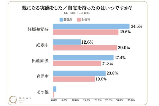 ・「妊娠中」に親になる実感・自覚を持った女性は29.0%いたにも関わらず、男性は12.6%にとどまった。また、女性の58.6%は産前に親になる自覚を持った一方、男性の51.2%は産後という結果に。