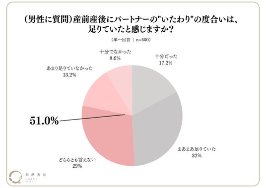 「産前産後に男性自身/パートナーからの”いたわり”は足りていたと感じますか?」という質問に対し、男性の49.2%は「十分だった」「まあまあ足りていた」と回答しました。一方で、「どちらとも言えない」「あまり足りていなかった」「十分でなかった」と回答した人は51.0%という結果になりました。