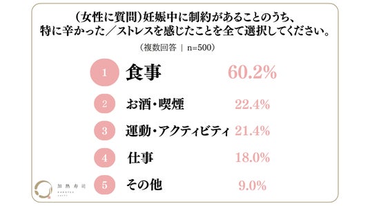 妊娠中に特に辛かった、またはストレスを感じたことを女性に尋ねたところ、最も多かった回答は「食事(60.2%)」でした。食べ物の制限や嗜好の変化に対応することが、多くの妊婦にとって大きな負担となっていることがわかります。