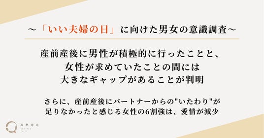 妊娠中でも安心して食べられる加熱したお寿司を販売する「加熱寿司」(かねつずし)は、20代~40代の男女1,000名を対象に、11月22日の「いい夫婦の日」に向けて、産前産後における男女間の意識調査を実施しました。