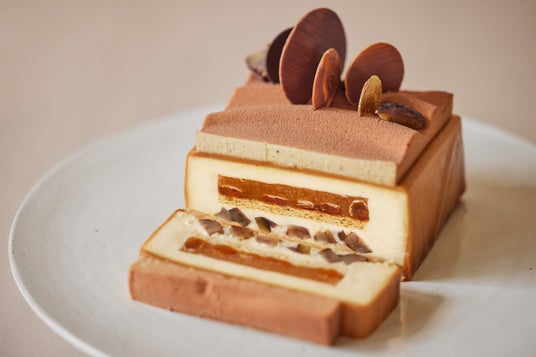 『KAGA』は、ホワイトチョコレートとミルクチョコレートのムースや生地に二番茶の茎を使用したほうじ茶をあわせ、アクセントに黒豆を加えました。表面のムースには、石川県白山市に蔵元のある甘酒をミックスし優しい甘さと風味に仕上げました。