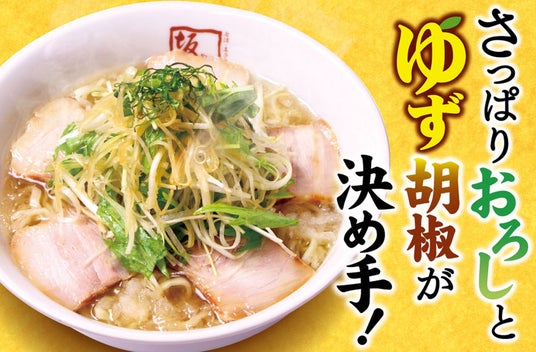 ■商品の特徴:ゆず胡椒を溶かし入れたスープに、みぞれ(大根お ろし)を浮かべ、大根・しらがねぎ・水菜・貝割れにピリ辛の特製 ダレを和えた野菜と、自家製トロ旨焼豚を5枚盛った、まろやかな コクの中にさっぱり感を盛り込んだラーメン。散らした大葉と、ふ わっと香る柚子が、“和”を思い起こさせる商品です。