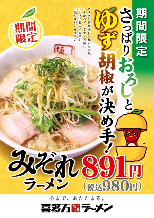 秋の季節限定ラーメン「みぞれラーメン」は、まろやかなコク深いスープに、大根おろし(みぞれ)とゆ ず胡椒を溶かし、風味豊かに仕上げた“和”を感じるラーメンです。彩りを加えるたっぷり野菜は、ピリ 辛の特製ダレで和えた大根・しらがねぎ・水菜・貝 割れ。トップにあしらう大葉の香りが上品な味わい を演出します。2007年、初めての季節限定ラーメンとして登場した当商品は、坂内特有のまろやかで コクがある透明豚骨スープを活かしつつ、繊細な和のアレンジを加えることができないかと考え、何度 も試作を重ねて開発いたしました。多くの酵素が含まれる栄養たっぷりな大根おろしと、爽やかなゆず の香りと唐辛子の辛みが食欲を促進させるゆず胡椒。日本料理を代表するこの二つの薬味を大胆にも使用し、従来の喜多方ラーメンを革新的にアレンジした自慢の逸品です。女性からの支持を多く得ている上位商品でもあり、店内調理だからこそご堪能いただ ける “出来立て“のフレッシュな香りや味わいをさらに感じていただける「みぞれラーメン」を自信をもってご提供いたします。