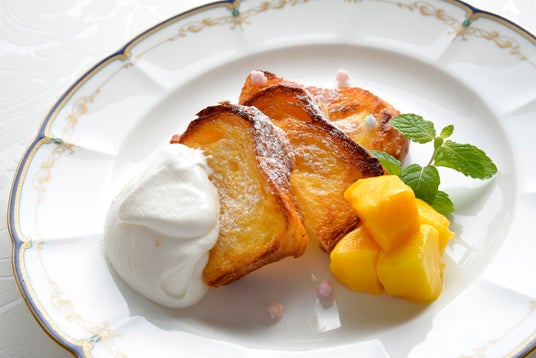 【アールグレイフレンチトースト】ホテルブレッドに香り高いアールグレイをたっぷり染み込ませ、バターで丁寧に焼き上げた一品。口に入れるたびにアールグレイの華やかな香りがふわりと鼻を抜け、隠し味として加えたオレンジリキュールが爽やかな奥深い味わいを演出します。外側はカリッと香ばしく、中はしっとりとした食感で、バターとアールグレイが織りなす絶妙なハーモニーが朝のひと時を豊かに彩ります。