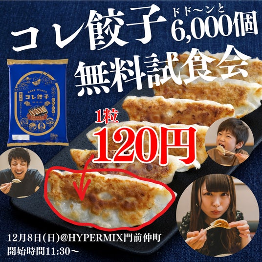 「コレ餃子」(本店埼玉県吉川市)が販売する冷凍餃子の試食会&ウェブCM撮影会を開催いたします。本イベントでは、今年発売開始の「コレ餃子」をドド~ンと6,000個ご試食できるほか、景品が当たるミニゲームやプロの撮影チームによる試食シーンの撮影があります。師走で何かと忙しい時期ではございますが、今年最後の大盤振る舞いです。多くのお客様にお楽しみいただけますと幸いです。
