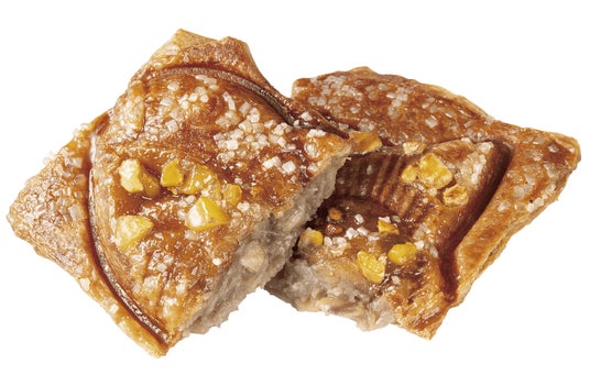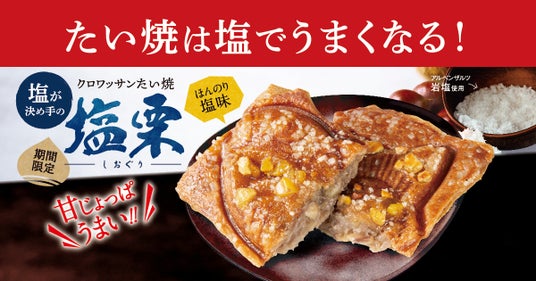 昨年、秋の新作として登場し大好評をいただいたクロワッサンたい焼 『塩栗』 、今年はさらなる美味しさ(餡の甘さと塩のバランス)を追求し、再登場!中の餡には全体の約4割以上に栗を使用している贅沢な “特製甘栗あん” に大きめにカットした栗を混ぜ込み、マロンペーストを練り込んだオリジナル生地の表面(片面のみ)に “ザラメ糖” と “岩塩をまぶした蜜漬けの甘栗” を乗せ、専用機器で両面から一気に香ばしく焼き上げます。 “特製甘栗あん” と、栗を引き立てる “岩塩” のバランスにこだわり、さらに美味しくなった 『塩栗』 、昨年お召し上がりいただいた 「塩栗ファン」 の方、「塩栗初体験」 の方も、ぜひ一度お試しください!