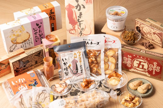 OMOベースにあるショップでは、イカマルシェと題して、ご近所さんや函館で人気のある、イカを使った商品を15種類販売します。イカが描かれたパッケージに、イカの形をした最中やまんじゅうなど、かわいらしい商品を集めました。例えば、1929年創業のベーカリー「King Bake」のオリジナル商品である「イカ伯爵の函館さきいかチョコレート」。チョコレートの風味とやわらかな甘さ、函館名物のさきいか「函館こがね」の塩気のバランスがやみつきになる商品です。また、トナミ食品工業が手作業で作る水産加工品「いか徳利」は、イカを干した後にひとつひとつ裏返し、イカのエキスが出過ぎないように丁寧に加工しています。お酒に溶け出したイカの風味を味わった後、炙ってつまみにもなる一品です。商品を販売するお店の情報や作り手の思いを知れる紹介カードをみながら、函館ならではのイカの商品を楽しく選べます。OMOベースで食べたり、旅のお土産にしたり、思い思いに手に取って味わえるマルシェです。