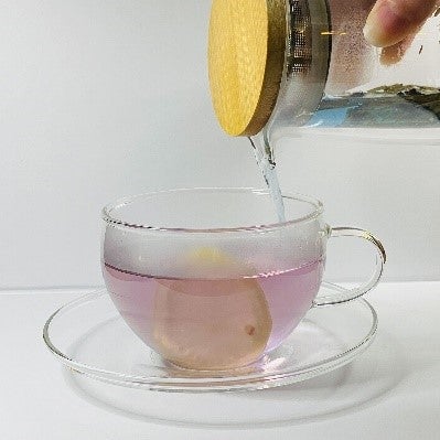 レモンを浮かべた透明カップにハーブティーを注ぐと、あら不思議、ブルーだったハーブティーがかわいい紫がかったピンクに変わります。