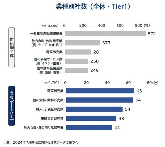 供給網を構成する企業を業種別に見ると、配送業務などを担う「一般貨物自動車運送」が872社を占めた。店舗間配送のほか、ヨーカ堂向けに物品を供給する企業間輸送などの業務が多いことを背景に、「他の食料・飲料卸(バター、水産練り製品など)」(377社)に比べて2倍以上の水準だった。このうち、ヨーカ堂と直接取引を行う企業(Tier1)をみると、「野菜卸」(65社)が最も多く、「他の食料・飲料卸」(64社)、「生鮮魚介卸」(48社)など、生鮮食品を中心とした商社が多くみられた。また、同社の特徴として祖業の衣料品に強みがあったことも背景に、「婦人・子供服卸」(54社)などアパレル産業も上位となった。