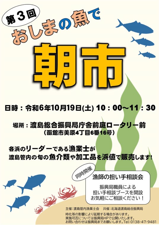 10/19(土)函館市で、『おしまの魚で「朝市」』を今年も開催します。