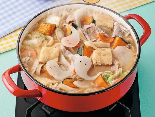 甘みがあるかぼちゃと、もちもちのほうとうが入ったあったか鍋。みそで煮込んだ野菜は、野菜が苦手なお子さまでもパクパク食べられる、人気の美味しさです♪今回は大根をおばけに見立ててアレンジしています!