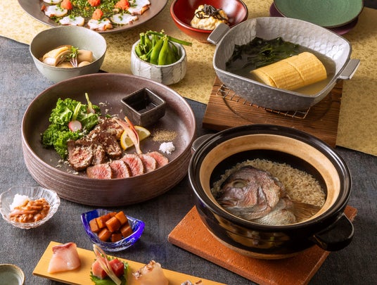 伊賀焼の特性を活かした土鍋でお米をふっくら炊き上げる、自慢の「名物 真鯛土鍋御飯」には、愛媛・瀬戸内海産の真鯛を使用。日本三大潮流に数えられる来島海峡の潮流で育った鯛は身が締まり、うま味も多く含まれています。また、こだわりの「出汁巻き玉子」は、鰹・宗田鰹・鯖・昆布の絶妙な配合によるコクと香りを持つお出汁と一緒に食するぜいたくな逸品です。